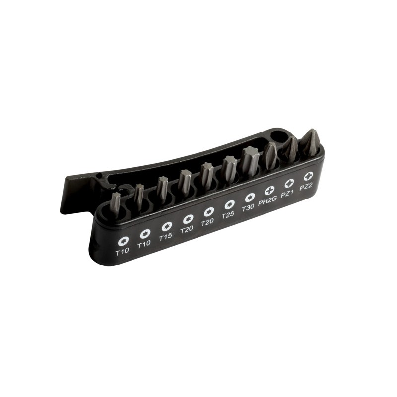 Juego de puntas de 1/4" para tornillos de cabeza Phillips, Pozidriv y TORX® en un soporte de plástico con clip para el cinturón (10 piezas)